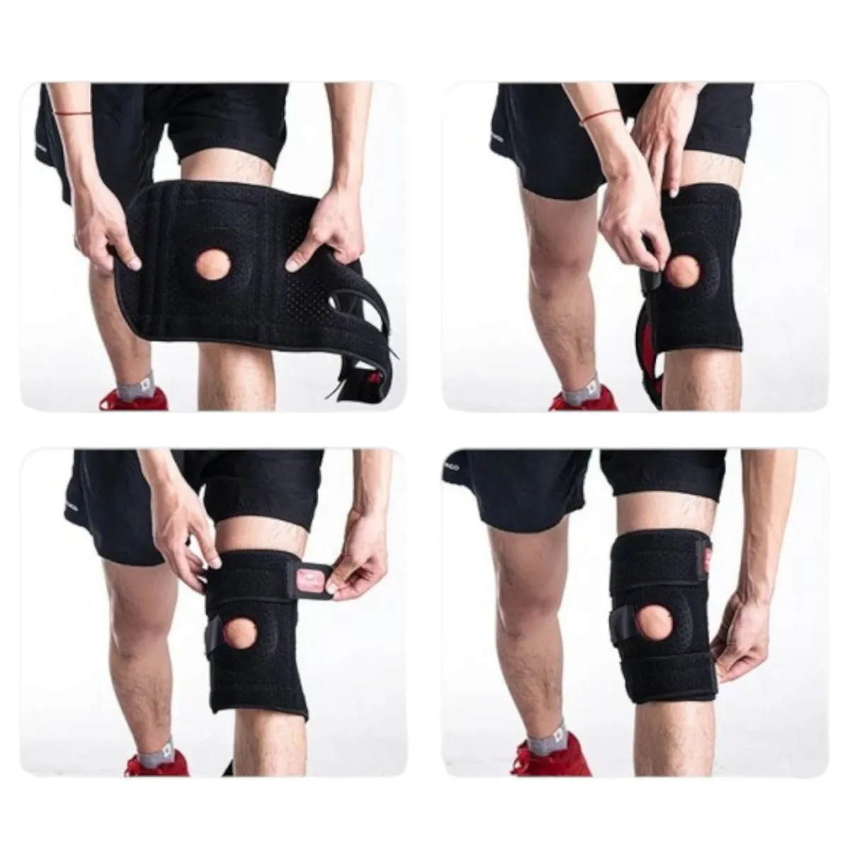Rodillera estabilizadora con soporte de 4 resortes, diseñada para proteger la rodilla durante la actividad física y prevenir lesiones en la rótula. Fabricada con materiales resistentes y de secado rápido, ofrece durabilidad, comodidad y un diseño flexible con correas ajustables según la necesidad.