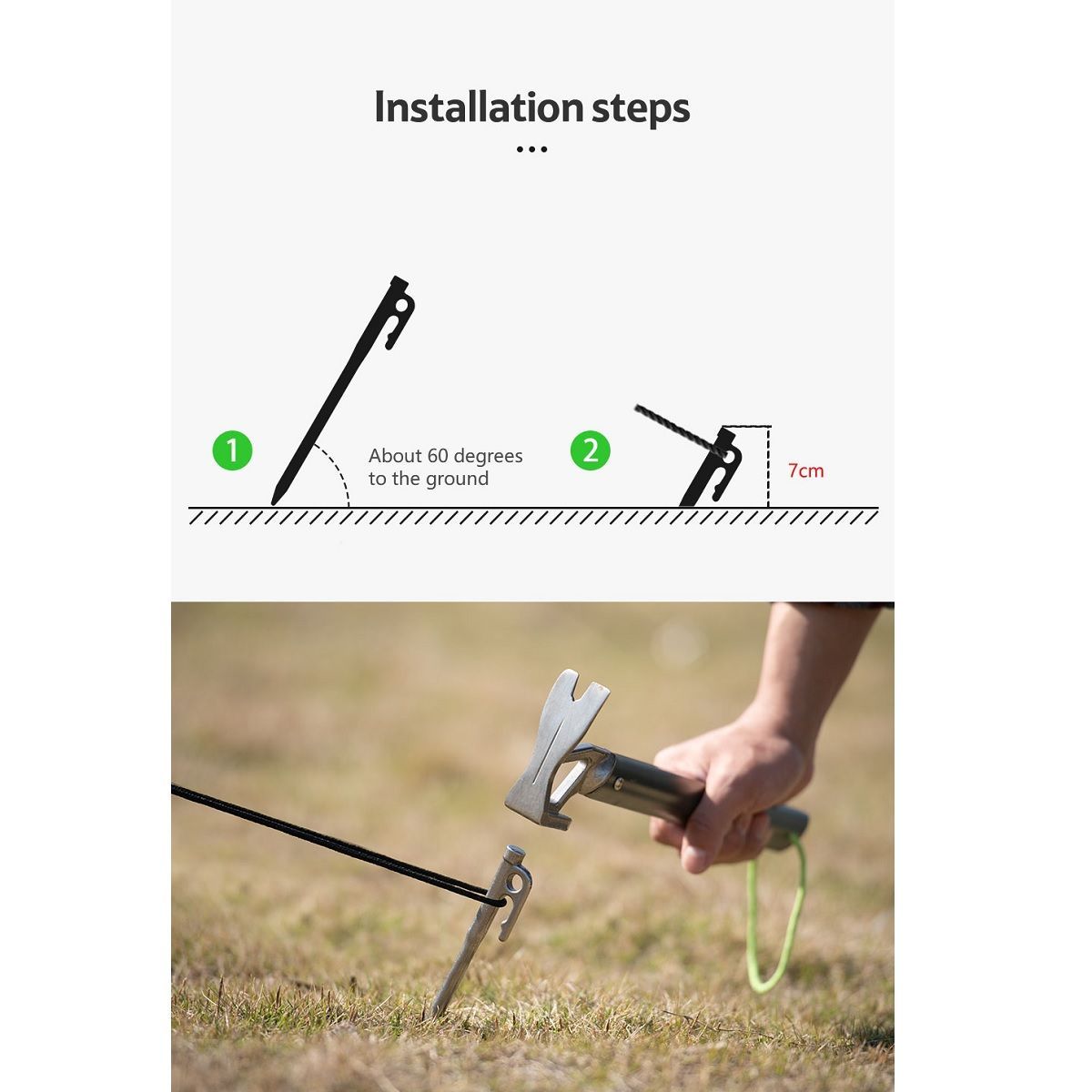 • Con dos formas de atar la estaca, la cuerda se puede insertar en el agujero o se puede enrollar alrededor del cuello de la estaca.