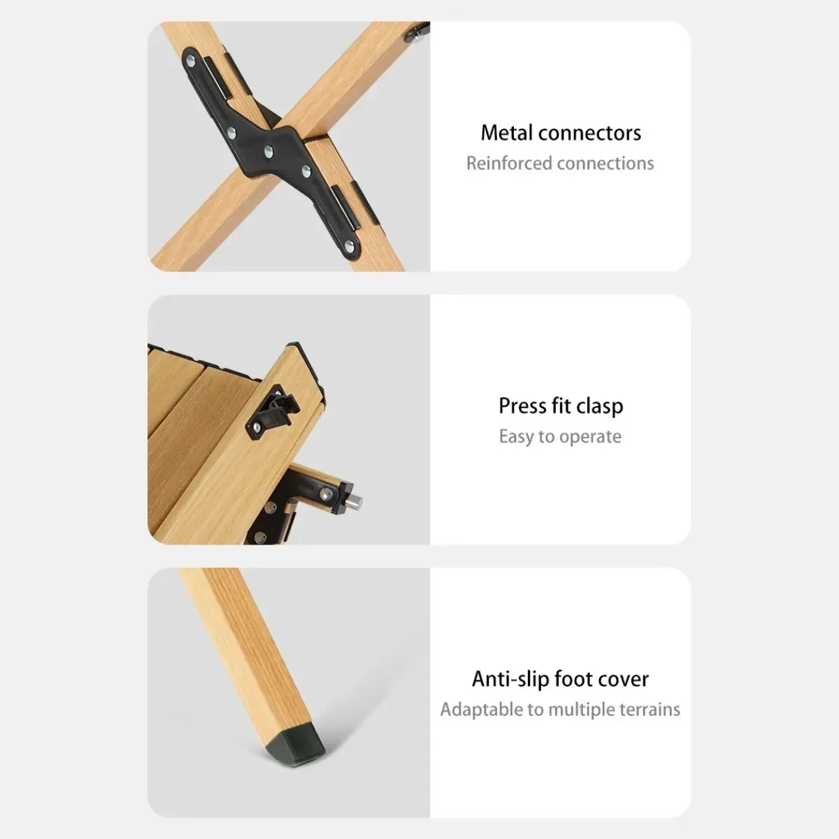 • Estructura estable: Piernas trianguladas con conectores metálicos y refuerzos de juntas