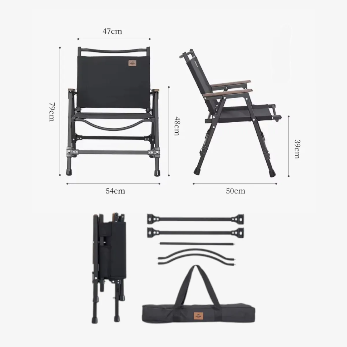 El respaldo y el asiento están confeccionados en resistente tela Oxford 600D, que permite una buena ventilación y brinda confort en días calurosos. Se pliega de dos maneras distintas, facilitando el guardado y el traslado, mientras que los apoyabrazos de madera de haya aportan un toque cálido y mayor comodidad. Incluye una práctica bolsa con manijas para su transporte.
