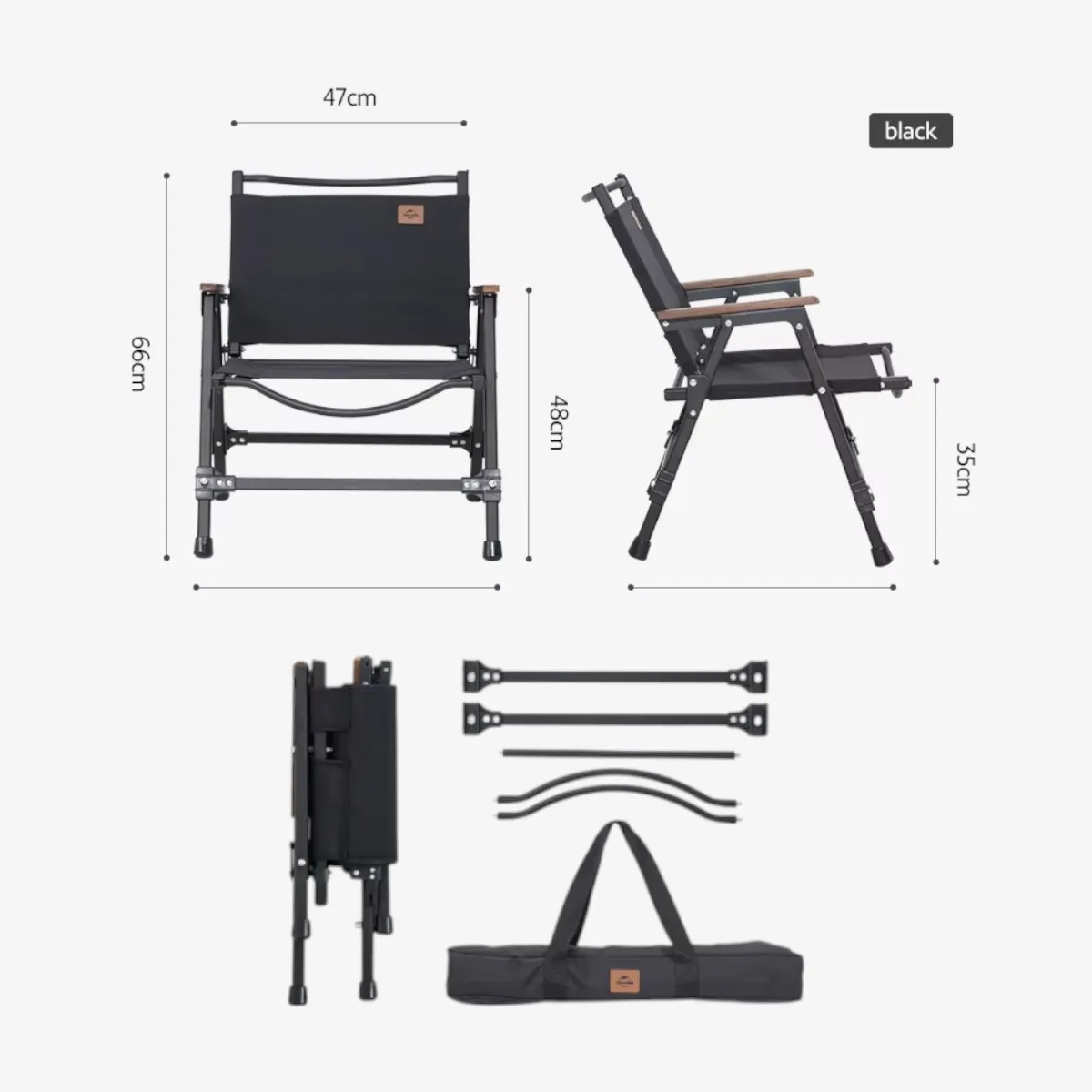 El respaldo y el asiento están confeccionados en resistente tela Oxford 600D, que permite una buena ventilación y brinda confort en días calurosos. Se pliega de dos maneras distintas, facilitando el guardado y el traslado, mientras que los apoyabrazos de madera de haya aportan un toque cálido y mayor comodidad. Incluye una práctica bolsa con manijas para su transporte.