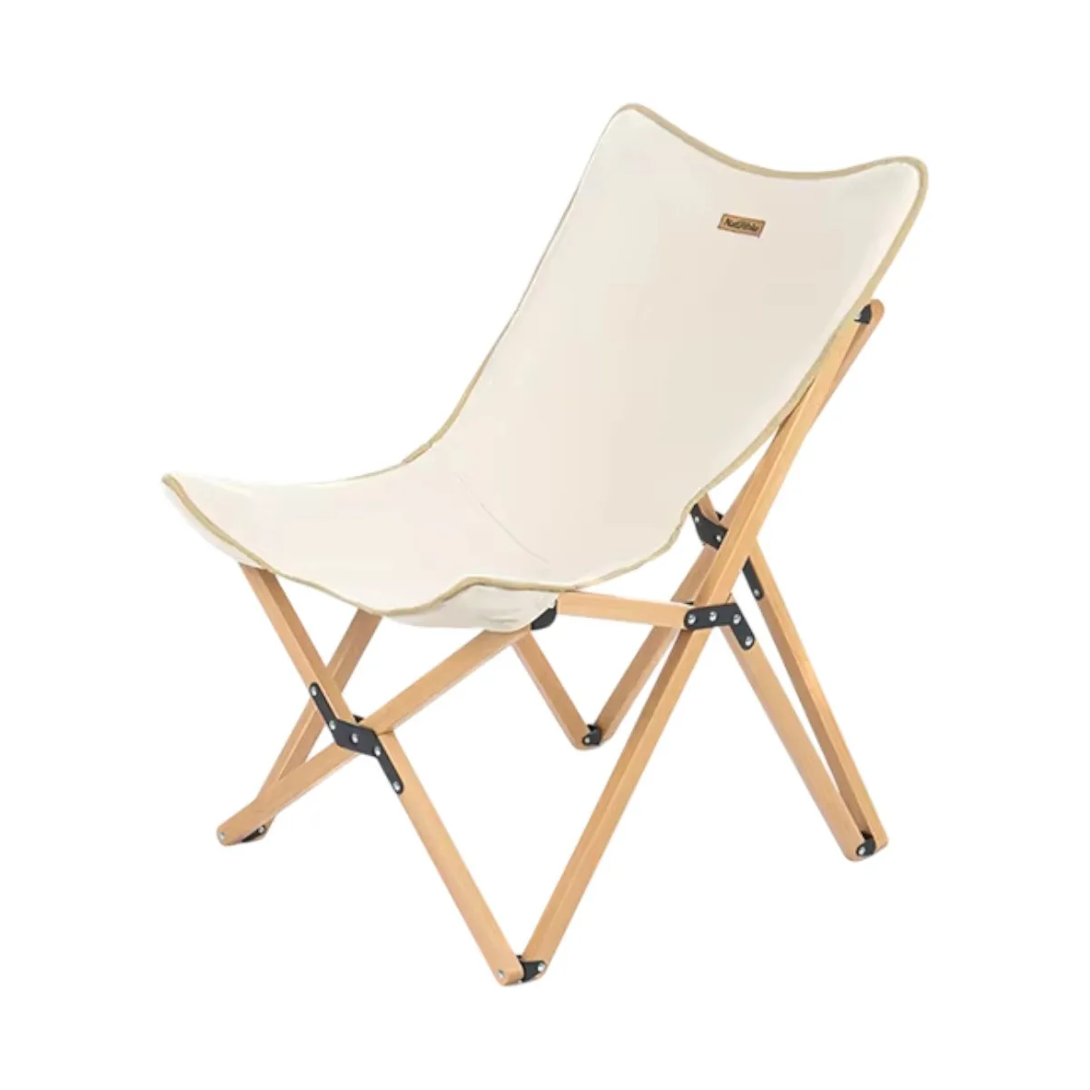 Silla plegable de camping con estructura de madera y estilo vintage. Fabricada con madera natural, cuenta con un asiento pensado para optimizar la postura al sentarse, mejorando la comodidad.