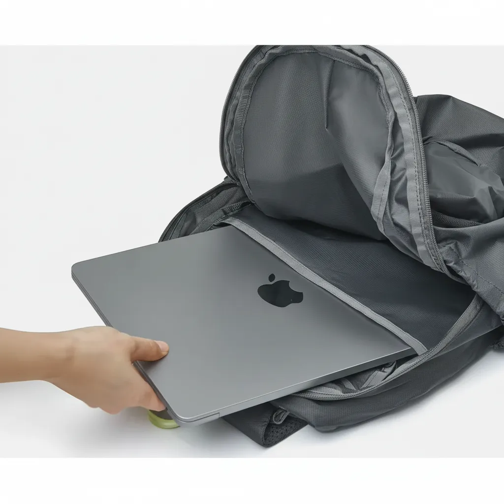 Mochila plegable de 20 L fabricada en nylon antidesgarro 70D con acabado repelente al agua, liviana y cómoda gracias a su panel trasero de malla 3D. Ofrece espacio para notebook de hasta 14” y múltiples bolsillos funcionales. Además, cuenta con una correa para fijarla al equipaje, ideal para distintos usos y viajes.
